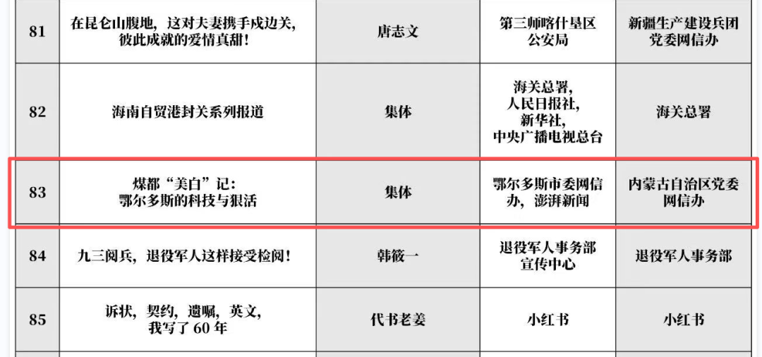 由鄂尔多斯市委网信办指导,彭拜新闻创作的作品《煤都“美白”记:鄂尔多斯科技与狠活》,入选网络精品之网络正能量文字。